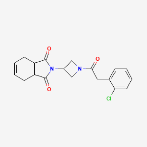 The compound 2-{1-[2-(2-chlorophenyl)acetyl]azetidin-3-yl}-2,3,3a,4,7,7a-hexahydro-1H-isoindole-1,3-dione (CAS: 1904193-33-4) is a heterocyclic organic molecule with a molecular formula of C₁₉H₁₉ClN₂O₃ and a molecular weight of 358.8 g/mol . Its structure comprises an azetidine ring conjugated to a hexahydro-isoindole-1,3-dione core, functionalized with a 2-chlorophenylacetyl group. The SMILES representation (O=C(Cc1ccccc1Cl)N1CC(N2C(=O)C3CC=CCC3C2=O)C1) highlights the connectivity of the azetidine and isoindole-dione moieties, along with the chlorinated aromatic substituent . Physical properties such as density, melting point, and boiling point remain unreported in available literature .
