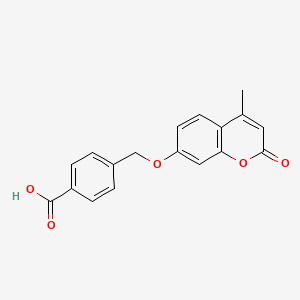 4-{[(4-Methyl-2-oxo-2H-chromen-7-yl)oxy]methyl}benzoic acid (CAS: 314741-98-5) is a coumarin-derived compound with a molecular formula of C₁₈H₁₄O₅ and a molecular weight of 310.30 g/mol . Its structure comprises a 4-methyl-2-oxo-2H-chromen-7-yl (coumarin) core linked via an ether bridge to a benzoic acid group at the para position (Figure 1). This hybrid structure combines the photophysical properties of coumarins with the carboxylic acid functionality, making it a candidate for applications in medicinal chemistry and materials science.