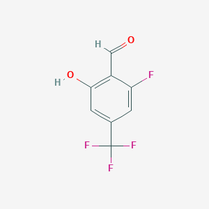The synthesis of 2-Fluoro-6-hydroxy-4-(trifluoromethyl)benzaldehyde typically involves the introduction of the fluorine, hydroxyl, and trifluoromethyl groups onto a benzaldehyde ring. One common method involves the fluorination of a suitable precursor, followed by hydroxylation and trifluoromethylation reactions. The specific reaction conditions, such as temperature, solvents, and catalysts, can vary depending on the desired yield and purity .