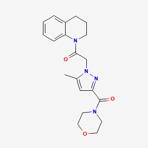 This compound is a hybrid molecule combining a 3,4-dihydroquinoline scaffold with a 5-methylpyrazole moiety linked via an ethanone bridge. The pyrazole ring is further functionalized with a morpholine-4-carbonyl group, which may enhance solubility and modulate biological interactions.