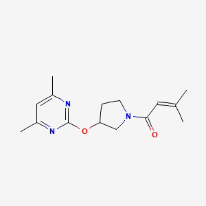 1-(3-((4,6-Dimethylpyrimidin-2-yl)oxy)pyrrolidin-1-yl)-3-methylbut-2-en-1-one is a synthetic organic compound with a complex structure that includes a pyrimidine ring, a pyrrolidine ring, and a conjugated enone system. This compound has garnered attention in medicinal chemistry for its potential biological activities, particularly in enzyme inhibition and receptor modulation.