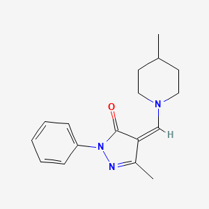 (4Z)-3-methyl-4-[(4-methylpiperidin-1-yl)methylidene]-1-phenyl-4,5-dihydro-1H-pyrazol-5-one is a synthetic compound belonging to the pyrazolone class, which has garnered attention for its diverse biological activities. This compound's structure features a pyrazolone core linked to a piperidine moiety, suggesting potential interactions with various biological targets.