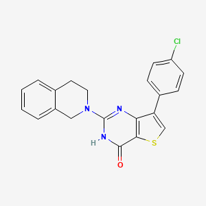 The compound features a thieno[3,2-d]pyrimidin-4(3H)-one core, which is conjugated with a 4-chlorophenyl group and a 3,4-dihydroisoquinoline moiety. This unique combination is believed to contribute to its pharmacological properties.