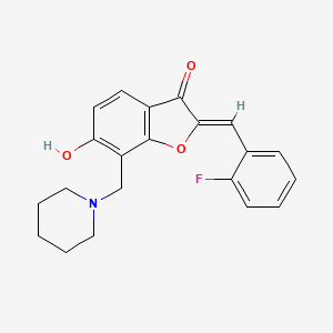 (Z)-2-(2-fluorobenzylidene)-6-hydroxy-7-(piperidin-1-ylmethyl)benzofuran-3(2H)-one is a complex organic compound that has attracted attention in medicinal chemistry due to its unique structural features and potential biological activities. This compound, also referred to as a benzofuran derivative, exhibits properties that may have implications in various therapeutic areas, including anti-inflammatory and anticancer activities. This article compiles findings from diverse sources to provide a comprehensive overview of its biological activity.