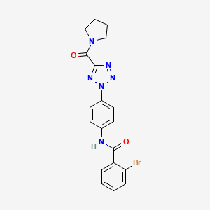 The synthesis of 2-bromo-N-(4-(5-(pyrrolidine-1-carbonyl)-2H-tetrazol-2-yl)phenyl)benzamide typically involves multiple steps. One common approach starts with the bromination of a suitable benzamide precursor. The brominated intermediate is then subjected to a series of reactions to introduce the pyrrolidine and tetrazole rings. These steps often involve the use of reagents such as pyrrolidine, tetrazole, and various catalysts under controlled conditions .