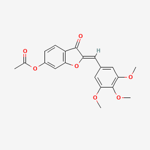 The synthesis of (2Z)-3-oxo-2-(3,4,5-trimethoxybenzylidene)-2,3-dihydro-1-benzofuran-6-yl acetate typically involves multiple steps, starting from readily available precursors. One common synthetic route includes the condensation of 3,4,5-trimethoxybenzaldehyde with a suitable benzofuran derivative under acidic or basic conditions to form the benzylidene intermediate. This intermediate is then subjected to acetylation using acetic anhydride or acetyl chloride in the presence of a catalyst such as pyridine or triethylamine to yield the final product.