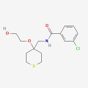 The synthesis of 3-chloro-N-((4-(2-hydroxyethoxy)tetrahydro-2H-thiopyran-4-yl)methyl)benzamide typically involves multi-step organic reactions. One common approach is to start with the preparation of the tetrahydrothiopyran ring, followed by the introduction of the hydroxyethoxy group. The final step involves the coupling of this intermediate with 3-chlorobenzoyl chloride under basic conditions to form the desired benzamide.