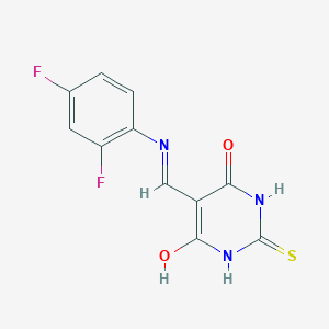 The synthesis of 5-{[(2,4-difluorophenyl)amino]methylidene}-2-sulfanylidene-1,3-diazinane-4,6-dione typically involves the reaction of appropriate precursors under controlled conditions. One common method involves the condensation of 2,4-difluoroaniline with a suitable diazinane derivative in the presence of a sulfur source. The reaction conditions often include the use of solvents such as dichloromethane or ethanol and may require heating to facilitate the reaction.