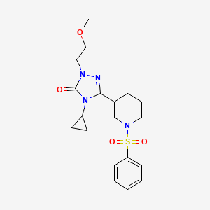 The mechanism of action of 3-[1-(benzenesulfonyl)piperidin-3-yl]-4-cyclopropyl-1-(2-methoxyethyl)-4,5-dihydro-1H-1,2,4-triazol-5-one involves its interaction with specific molecular targets. These targets may include enzymes, receptors, or ion channels. The compound’s structure allows it to bind to these targets, modulating their activity and leading to various biological effects.