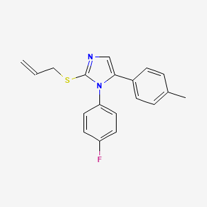 The compound features an imidazole ring substituted with an allylthio group, a 4-fluorophenyl moiety, and a p-tolyl group. Its unique structure contributes to its biological activity, allowing it to interact with various molecular targets.