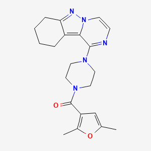 The synthesis of 1-(2,5-dimethylfuran-3-carbonyl)-4-{7H,8H,9H,10H-pyrazino[1,2-b]indazol-1-yl}piperazine typically involves multiple steps. One common approach is to start with the preparation of the 2,5-dimethylfuran-3-carbonyl intermediate, which can be synthesized through the acylation of 2,5-dimethylfuran. This intermediate is then reacted with piperazine to form 1-(2,5-dimethylfuran-3-carbonyl)piperazine .