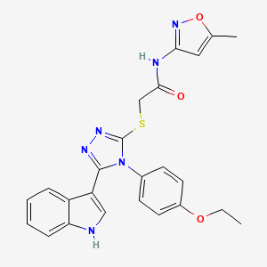 The synthesis of 2-{[4-(4-ethoxyphenyl)-5-(1H-indol-3-yl)-4H-1,2,4-triazol-3-yl]sulfanyl}-N-(5-methyl-1,2-oxazol-3-yl)acetamide typically involves multi-step organic reactions. The process begins with the preparation of the core triazole structure, followed by the introduction of the indole and ethoxyphenyl groups. The final steps involve the addition of the sulfanyl and oxazolyl groups under controlled conditions to ensure the desired product is obtained.