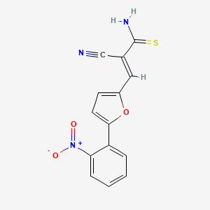 (E)-2-cyano-3-(5-(2-nitrophenyl)furan-2-yl)prop-2-enethioamide is a thioamide-functionalized acrylonitrile derivative featuring a 2-nitrophenyl-substituted furan moiety. The compound’s structure combines electron-withdrawing groups (cyano, nitro) with a thioamide group, conferring unique electronic and steric properties.