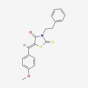 The synthesis of (Z)-5-(4-methoxybenzylidene)-3-phenethyl-2-thioxothiazolidin-4-one typically involves the condensation of 4-methoxybenzaldehyde with 3-phenethyl-2-thioxothiazolidin-4-one under basic conditions. A common method includes the use of sodium hydroxide (NaOH) as a base in a solvent such as ethanol or methanol. The reaction is carried out at room temperature, and the product is isolated by filtration and recrystallization .