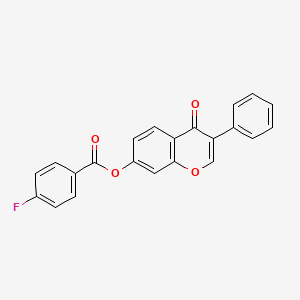 The synthesis of 4-oxo-3-phenyl-4H-chromen-7-yl 4-fluorobenzoate typically involves the condensation of 4-oxo-3-phenyl-4H-chromen-7-ol with 4-fluorobenzoic acid or its derivatives. The reaction is usually carried out in the presence of a dehydrating agent such as dicyclohexylcarbodiimide (DCC) and a catalyst like 4-dimethylaminopyridine (DMAP) to facilitate esterification. The reaction conditions often include refluxing in an organic solvent like dichloromethane or toluene.