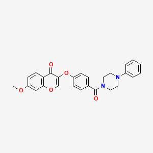 The mechanism of action of 7-methoxy-3-(4-(4-phenylpiperazine-1-carbonyl)phenoxy)-4H-chromen-4-one involves its interaction with specific molecular targets and pathways. The phenylpiperazine moiety is known to interact with various receptors and enzymes, potentially modulating their activity. The chromenone core may also contribute to the compound’s biological effects by interacting with cellular signaling pathways. Further research is needed to fully elucidate the precise molecular mechanisms involved.
