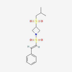The compound is characterized by a unique azetidine ring substituted with isobutylsulfonyl and styrylsulfonyl groups. Its molecular formula is , and it has a molecular weight of approximately 301.38 g/mol. The presence of sulfonyl groups is significant as they often enhance the compound's solubility and biological activity.