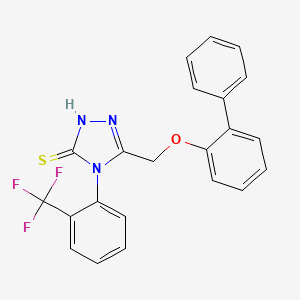 5-(2-phenylphenoxymethyl)-4-[2-(trifluoromethyl)phenyl]-4H-1,2,4-triazole-3-thiol is a compound belonging to the triazole family, which has garnered attention for its diverse biological activities. This compound features a thiol group and a complex aromatic structure that may enhance its pharmacological properties. The triazole moiety is known for its stability and ability to interact with biological receptors, making it a significant scaffold in medicinal chemistry.