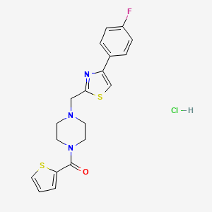 The compound “(4-((4-(4-fluorophenyl)thiazol-2-yl)methyl)piperazin-1-yl)(thiophen-2-yl)methanone hydrochloride” is a structurally complex molecule featuring a piperazine core substituted with a thiazole ring bearing a 4-fluorophenyl group and a thiophene-2-yl methanone moiety. Its synthesis likely involves coupling reactions between piperazine derivatives and functionalized thiazole or thiophene precursors, as inferred from analogous synthetic routes in the literature . The hydrochloride salt improves solubility, facilitating pharmacological evaluation .