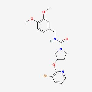 3-((3-Bromopyridin-2-yl)oxy)-N-(3,4-dimethoxybenzyl)pyrrolidine-1-carboxamide is a synthetic small molecule featuring a pyrrolidine carboxamide core. Key structural elements include: