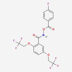 The mechanism of action of N-((4-fluorobenzoyl)oxy)-2,5-bis(2,2,2-trifluoroethoxy)benzenecarboxamide involves its interaction with specific molecular targets and pathways. The presence of fluorine atoms enhances its binding affinity to certain enzymes and receptors, leading to its biological effects. The exact molecular targets and pathways depend on the specific application and context of use .