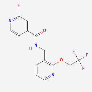 2-fluoro-N-{[2-(2,2,2-trifluoroethoxy)pyridin-3-yl]methyl}pyridine-4-carboxamide is a fluorinated pyridine derivative. Fluorinated compounds are known for their unique chemical and biological properties, often used in pharmaceuticals, agrochemicals, and materials science due to their stability and reactivity.