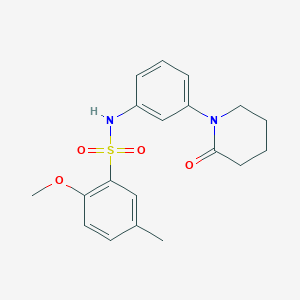 The synthesis of 2-methoxy-5-methyl-N-(3-(2-oxopiperidin-1-yl)phenyl)benzenesulfonamide typically involves multiple steps, including the formation of intermediate compounds. The synthetic route often starts with the preparation of the piperidine ring, followed by the introduction of the sulfonamide group and the methoxy and methyl substituents on the benzene ring. Reaction conditions such as temperature, solvent, and catalysts play a crucial role in the efficiency and yield of the synthesis. Industrial production methods may involve optimization of these conditions to scale up the process while maintaining high purity and yield.