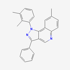 1-(2,3-Dimethylphenyl)-8-methyl-3-phenyl-1H-pyrazolo[4,3-c]quinoline is a tricyclic heterocyclic compound featuring a pyrazole ring fused to a quinoline nucleus. This structural framework is associated with diverse biological and material science applications, including anti-inflammatory, anticancer, and anti-angiogenic activities . The substituents at positions 1, 3, and 8—specifically the 2,3-dimethylphenyl, phenyl, and methyl groups—impart unique physicochemical properties, such as enhanced lipophilicity and steric bulk, which influence its interactions in biological systems or material matrices .
