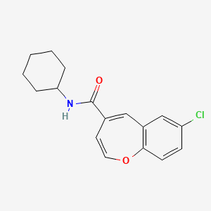 The synthesis of 7-chloro-N-cyclohexyl-1-benzoxepine-4-carboxamide typically involves the cyclization of appropriate precursors under specific conditions. One common method involves the reaction of 7-chloro-1-benzoxepine-4-carboxylic acid with cyclohexylamine. The reaction is usually carried out in the presence of a coupling agent such as N,N’-dicyclohexylcarbodiimide (DCC) and a catalyst like 4-dimethylaminopyridine (DMAP) in an organic solvent such as dichloromethane .