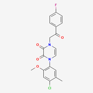 1-(4-chloro-2-methoxy-5-methylphenyl)-4-[2-(4-fluorophenyl)-2-oxoethyl]-1,2,3,4-tetrahydropyrazine-2,3-dione is a complex organic compound with potential applications in various scientific fields. This compound is characterized by its unique molecular structure, which includes a pyrazine-2,3-dione core substituted with chloro, methoxy, methyl, and fluorophenyl groups.