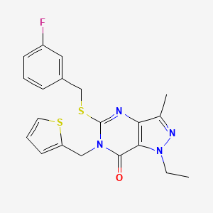 The synthesis of 1-ethyl-5-{[(3-fluorophenyl)methyl]sulfanyl}-3-methyl-6-[(thiophen-2-yl)methyl]-1H,6H,7H-pyrazolo[4,3-d]pyrimidin-7-one involves multiple steps, including the formation of the pyrazolo[4,3-d]pyrimidine core and subsequent functionalization. . Industrial production methods may involve optimization of reaction conditions, such as temperature, solvent, and catalysts, to achieve high yields and purity.
