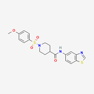 The synthesis of N-(1,3-benzothiazol-5-yl)-1-(4-methoxybenzenesulfonyl)piperidine-4-carboxamide typically involves the reaction of 1,3-benzothiazole derivatives with piperidine and sulfonamide components. The structural characterization is often confirmed using techniques such as Nuclear Magnetic Resonance (NMR) spectroscopy and Mass Spectrometry (MS).
