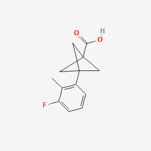 The mechanism of action of 3-(3-Fluoro-2-methylphenyl)bicyclo[1.1.1]pentane-1-carboxylic acid involves its interaction with specific molecular targets. The bicyclo[1.1.1]pentane core provides a rigid framework that can interact with enzymes or receptors, potentially inhibiting or modulating their activity. The fluoro and methyl groups on the phenyl ring can enhance binding affinity and selectivity towards these targets.