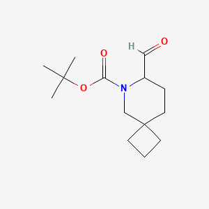 The compound features a 6-azaspiro[3.5]nonane core with a tert-butoxycarbonyl (Boc) protecting group at the 6-position and a formyl moiety at the 7-position. Its molecular formula is $$ \text{C}{14}\text{H}{23}\text{NO}_{3} $$, with a molecular weight of 253.34 g/mol. Key physicochemical properties include:
