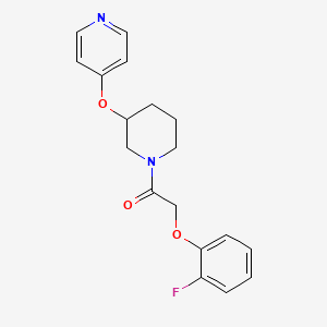 2-(2-Fluorophenoxy)-1-(3-(pyridin-4-yloxy)piperidin-1-yl)ethanone is a synthetic organic compound featuring a piperidine core substituted with a pyridin-4-yloxy group at the 3-position and an ethanone moiety at the 1-position. The ethanone group is further modified with a 2-fluorophenoxy substituent. This structure combines aromatic fluorination, heterocyclic diversity (piperidine and pyridine), and a ketone functional group, making it a candidate for pharmaceutical applications, particularly in kinase inhibition or central nervous system (CNS) targeting .