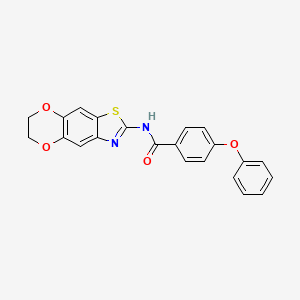 The synthesis of N-{10,13-dioxa-4-thia-6-azatricyclo[7.4.0.0^{3,7}]trideca-1,3(7),5,8-tetraen-5-yl}-4-phenoxybenzamide typically involves a multi-step process. One common approach begins with the preparation of the benzothiazole core, which is then fused with the dioxin ring system. The final step involves the introduction of the phenoxybenzamide moiety. Key reagents and conditions used in these steps include: