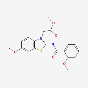 The target compound features a benzothiazole core fused with a dihydro ring system, substituted at position 2 with a (2-methoxybenzoyl)imino group and at position 3 with a methyl acetate moiety. The (2Z)-configuration of the imino group is critical, as it dictates the spatial arrangement of the 2-methoxybenzoyl substituent relative to the benzothiazole ring. The methoxy groups at positions 6 (benzothiazole) and 2’ (benzoyl) contribute to steric and electronic modulation, influencing reactivity in subsequent synthetic steps.