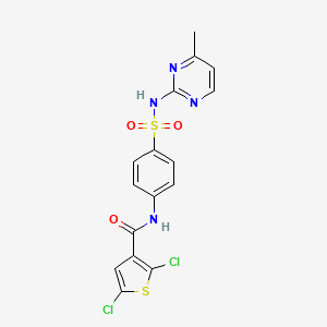 2,5-Dichloro-N-(4-(N-(4-methylpyrimidin-2-yl)sulfamoyl)phenyl)thiophene-3-carboxamide is a synthetic organic compound featuring a thiophene core substituted with two chlorine atoms at positions 2 and 5. The carboxamide group at position 3 of the thiophene is linked to a para-substituted phenyl ring, which is further functionalized with a sulfamoyl group (-SO₂NH-) connected to a 4-methylpyrimidin-2-yl moiety.