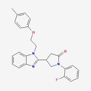 This compound belongs to a class of benzimidazole-pyrrolidinone hybrids, characterized by a 2-fluorophenyl group at position 1 of the pyrrolidin-2-one ring and a 1-(2-(p-tolyloxy)ethyl)-substituted benzimidazole moiety at position 4 . Such derivatives are often explored for pharmacological activity, leveraging the benzimidazole core’s affinity for biological targets .