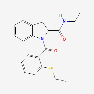 The mechanism of action of N-ethyl-1-(2-(ethylthio)benzoyl)indoline-2-carboxamide involves its interaction with specific molecular targets. The compound can bind to enzymes or receptors, modulating their activity. For example, it may inhibit the activity of certain enzymes by forming hydrogen bonds with key amino acid residues in the active site, thereby blocking substrate access. The exact molecular pathways involved depend on the specific biological context and target.