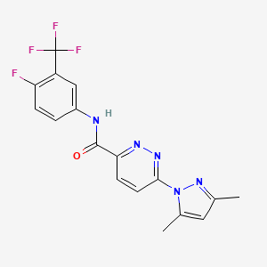 6-(3,5-Dimethyl-1H-pyrazol-1-yl)-N-(4-fluoro-3-(trifluoromethyl)phenyl)pyridazine-3-carboxamide is a heterocyclic compound featuring a pyridazine core substituted at position 6 with a 3,5-dimethylpyrazole moiety and at position 3 with a carboxamide group linked to a 4-fluoro-3-(trifluoromethyl)phenyl ring. The pyridazine scaffold (a six-membered ring with two adjacent nitrogen atoms) is known for its versatility in medicinal chemistry, often contributing to hydrogen bonding and π-π stacking interactions in biological targets . The trifluoromethyl (CF₃) and fluorine substituents on the phenyl ring enhance lipophilicity and metabolic stability, while the pyrazole group may modulate steric and electronic properties.