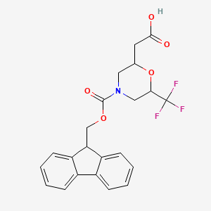 This compound is a morpholine derivative featuring a trifluoromethyl (-CF₃) group at the 6-position and a 9H-fluoren-9-ylmethoxycarbonyl (Fmoc) protecting group at the 4-position of the morpholine ring, linked to an acetic acid moiety. The Fmoc group is widely used in peptide synthesis to protect amines during solid-phase synthesis, while the trifluoromethyl group enhances lipophilicity and metabolic stability .