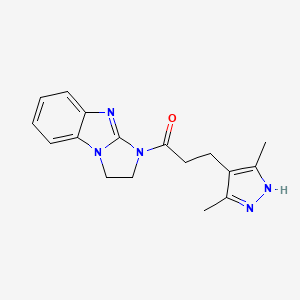 The compound 1-(2,3-dihydro-1H-benzo[d]imidazo[1,2-a]imidazol-1-yl)-3-(3,5-dimethyl-1H-pyrazol-4-yl)propan-1-one is a hybrid heterocyclic molecule featuring a benzo[d]imidazo[1,2-a]imidazole core linked via a propan-1-one chain to a 3,5-dimethylpyrazole moiety. This structure combines two pharmacologically significant heterocyclic systems: the benzoimidazoimidazole scaffold, which contributes to π-π stacking and hydrogen-bonding interactions, and the dimethylpyrazole group, which may enhance metabolic stability and lipophilicity.