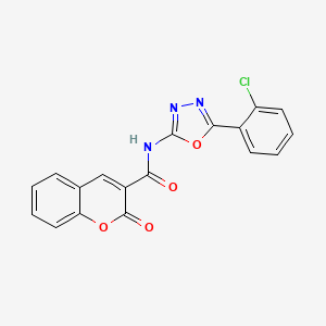 N-[5-(2-Chlorophenyl)-1,3,4-oxadiazol-2-yl]-2-oxo-2H-chromene-3-carboxamide is a synthetic hybrid molecule combining a coumarin (2H-chromen-2-one) core with a 1,3,4-oxadiazole heterocycle substituted at position 5 with a 2-chlorophenyl group. The carboxamide linkage at position 3 of the coumarin scaffold connects it to the oxadiazole moiety. This structural architecture is designed to leverage the pharmacological properties of both coumarins (e.g., anticoagulant, anti-inflammatory, and antimicrobial activities) and 1,3,4-oxadiazoles (notable for metabolic stability and hydrogen-bonding capacity in drug design) .