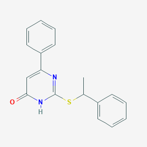 The synthesis of 6-phenyl-2-((1-phenylethyl)thio)pyrimidin-4(3H)-one typically involves the condensation of appropriate starting materials under controlled conditions. One possible route could involve the reaction of a phenyl-substituted pyrimidinone with a thioether reagent in the presence of a base or catalyst. The reaction conditions, such as temperature, solvent, and reaction time, would need to be optimized to achieve high yields and purity.