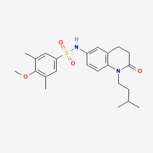 4-Methoxy-3,5-dimethyl-N-[1-(3-methylbutyl)-2-oxo-1,2,3,4-tetrahydroquinolin-6-yl]benzene-1-sulfonamide is a synthetic sulfonamide derivative with a complex heterocyclic scaffold. Its structure combines a tetrahydroquinoline core modified with a 3-methylbutyl side chain and a 2-oxo group, linked to a substituted benzene sulfonamide moiety. Its design leverages sulfonamide’s strong hydrogen-bonding capacity and the tetrahydroquinoline system’s conformational rigidity to enhance target binding specificity.