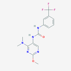 1-(4-(Dimethylamino)-2-methoxypyrimidin-5-yl)-3-(3-(trifluoromethyl)phenyl)urea is a urea-based small molecule characterized by a pyrimidine core substituted with a dimethylamino group at position 4 and a methoxy group at position 2. The urea linkage connects this pyrimidine moiety to a 3-(trifluoromethyl)phenyl group. The trifluoromethyl (CF₃) substituent is known to enhance metabolic stability and hydrophobic interactions in drug design, while the dimethylamino and methoxy groups may improve solubility and binding affinity .
