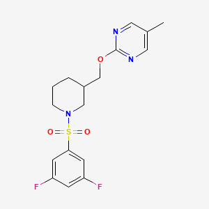 2-{[1-(3,5-Difluorobenzenesulfonyl)piperidin-3-yl]methoxy}-5-methylpyrimidine is a complex organic compound that has garnered interest in various scientific fields due to its unique chemical structure and potential applications. This compound features a piperidine ring, a sulfonyl group, and a pyrimidine moiety, making it a versatile molecule for research and industrial purposes.