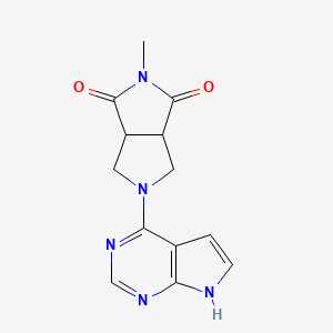 The synthesis of 2-methyl-5-{7H-pyrrolo[2,3-d]pyrimidin-4-yl}-octahydropyrrolo[3,4-c]pyrrole-1,3-dione typically involves multi-step organic reactions. One common method involves the condensation of a pyrrolo[2,3-d]pyrimidine derivative with a suitable amine, followed by cyclization and functional group modifications . The reaction conditions often require the use of inert atmospheres, such as nitrogen or argon, and specific temperature controls to ensure the desired product yield .