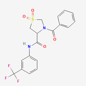 The mechanism by which 3-Benzoyl-N-(3-(trifluoromethyl)phenyl)thiazolidine-4-carboxamide 1,1-dioxide exerts its effects involves its interaction with molecular targets such as enzymes or receptors. The trifluoromethyl group enhances binding affinity and selectivity, while the thiazolidine ring provides structural rigidity. The exact pathways and targets depend on the specific application and biological context.